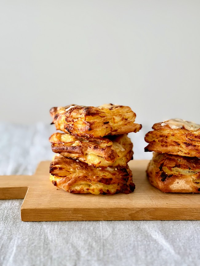 マッシュポテトを生地に折り込み、層状に重なったミルフィーユのように焼き上げます。